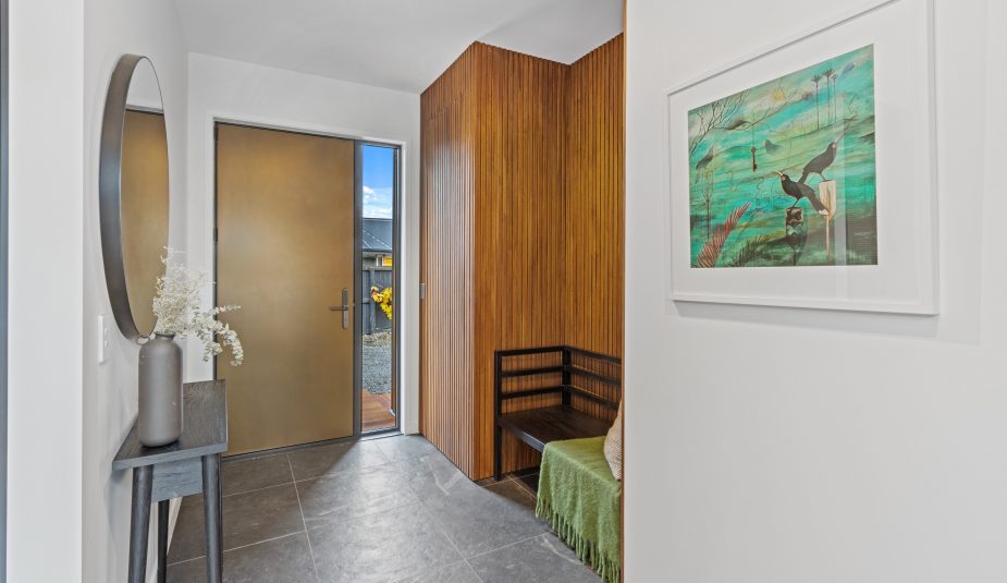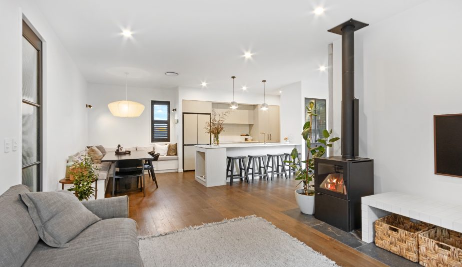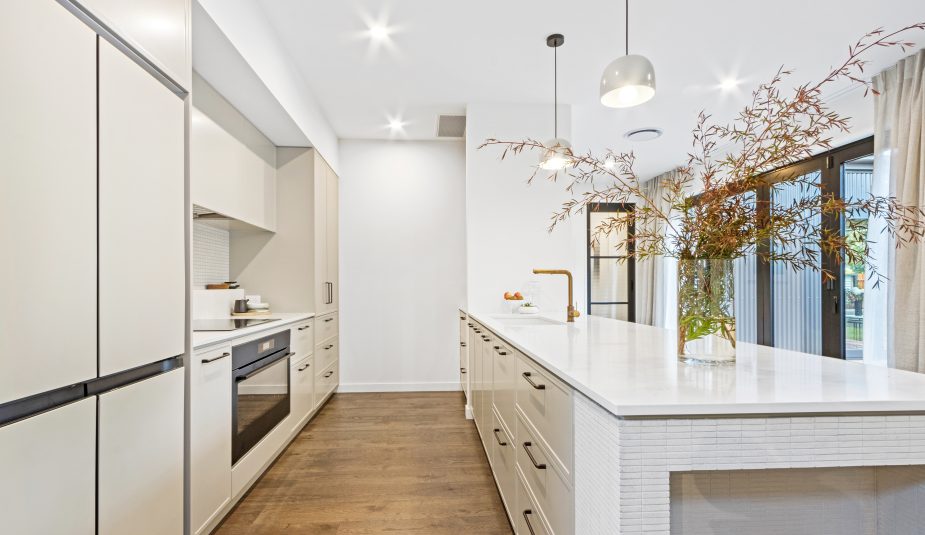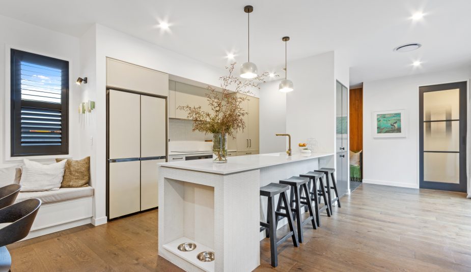 From the street, this home keeps things simple and understated, with clean architectural lines and a sleek modern silhouette. The coloured steel cladding adds warmth and depth, while the streamlined roof ties it all together beautifully. The high scissor-truss ceilings and oversized doors create an immediate sense of space and light within the compact 147sqm footprint.